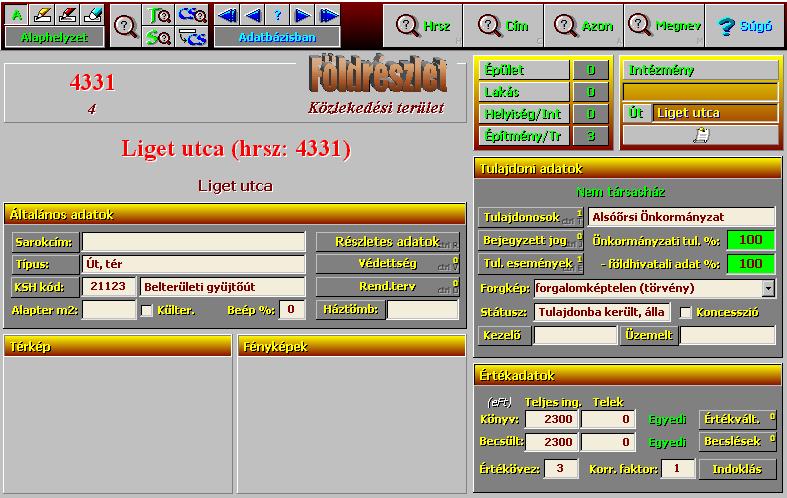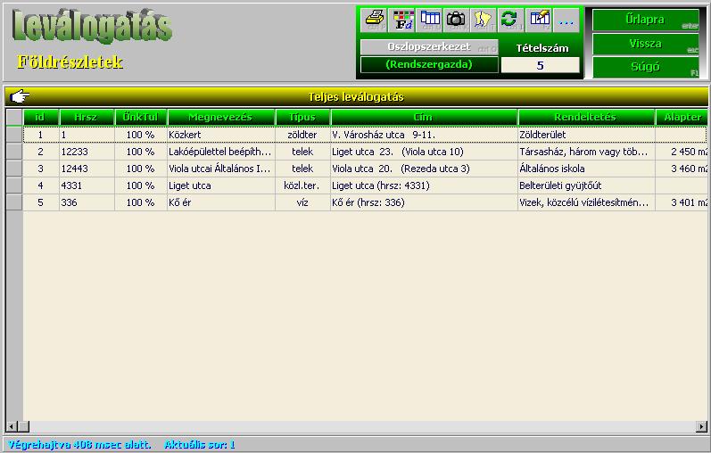 - Alaptípusok: építési telkek, termőföldek, egyéb művelés alól kivett területek, zöldterületek, közlekedési területek, vizek, köztemetők