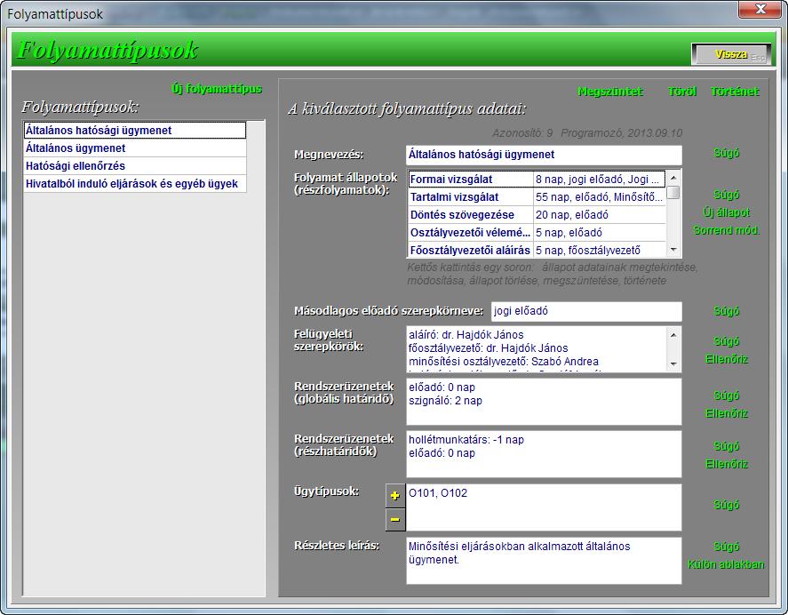 - "Történet": a kijelölt folyamattípus felvételének és módosításainak adatai.
